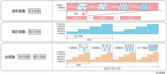 インバーター制御による独自の複合波形を4種類搭載、さらに出力電圧を6段階に設定し、治療される方の体力と体調に合った最適で効果的な治療が実現します。 治療波形は【25Hz・55Hz・85Hz・115Hz・波形変動】、治療電圧は【14000Vp・11000Vp・8000Vp・5000Vp・3500Vp・1400Vp・電圧変動】、タイマーは【10分・20分・30分・60分・4時間・6時間・8時間】よりお選びいただけます。