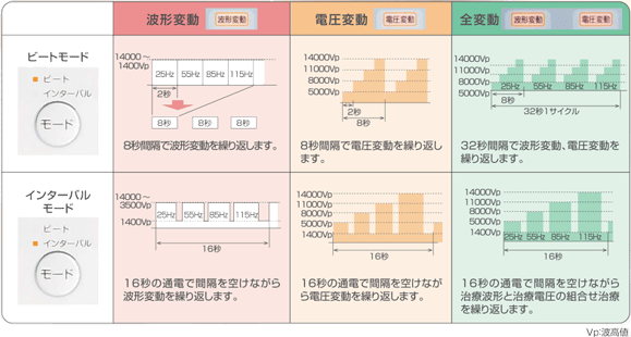 1400Vp出力で、ゆっくりおやすみになりながら4時間・6時間・8時間の長時間治療が可能です。高圧出力で治療を開始しても、60分後には自動的に1400Vp出力に切り替わります。忙しくてゆっくり治療できない方や、じっくり治療をしたい方にもおすすめ治療モードです。